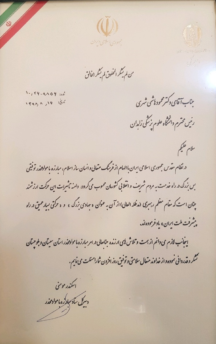 تقدیر از ریاست دانشگاه علوم پزشکی زاهدان در همایش بزرگ یاریگران زندگی به علت اختصاص تخت های بیمارستانی ویژه درمان معتادین و خدمات گسترده در مراکز کاهش آسیب و MMT