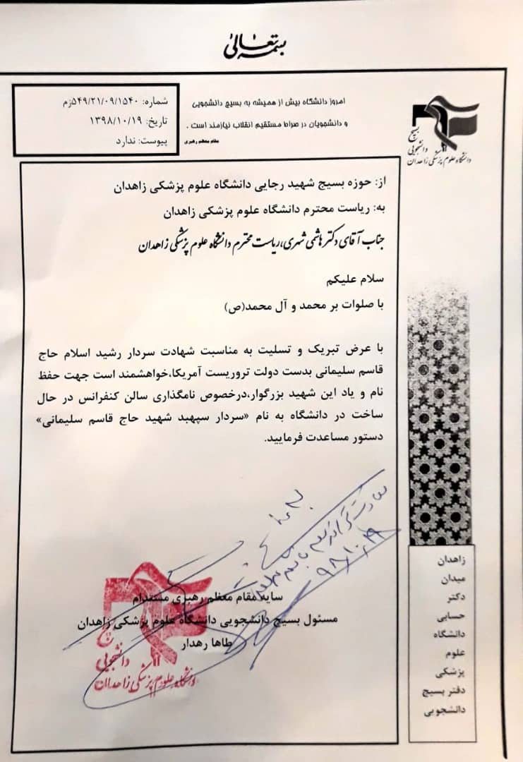 به دستور ریاست محترم دانشگاه علوم پزشکی زاهدان و با پیشنهاد بسیج دانشجویی، مجموعه در حال ساخت آمفی تئاتر دانشگاه علوم پزشکی زاهدان به نام سپهبد شهید حاج قاسم سلیمانی نامگذاری شد.
