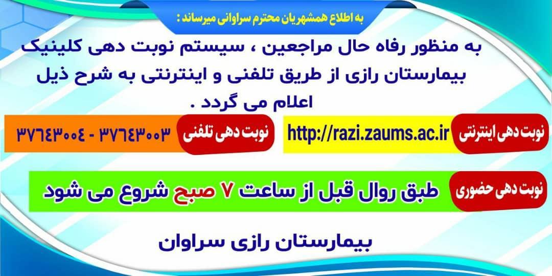 با استقرار سامانه نوبت دهی تلفنی و اینترنتی میزان مراجعه حضوری برای گرفتن نوبت در کلینیک های تخصصی دانشگاه علوم پزشکی زاهدان به کمترین میزان ممکن رسیده است.