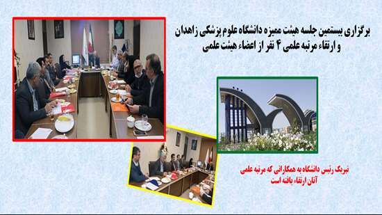 در بیستمین جلسه هیئت ممیزه دانشگاه علوم پزشکی و خدمات بهداشتی و درمانی زاهدان با ارتقاء مرتبه 4 نفر از اعضاء جلسه هیئت علمی دانشگاه موافقت شد.