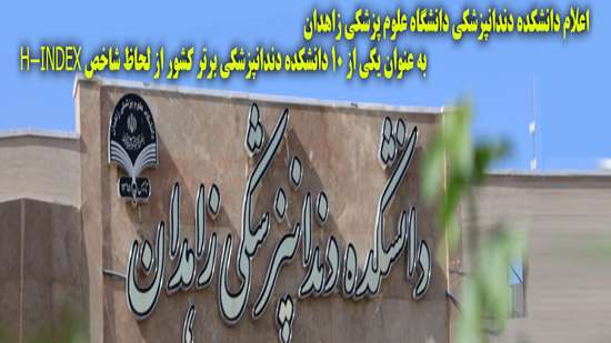 اعلام دانشکده دندانپزشکی دانشگاه علوم پزشکی زاهدان به عنوان یکی از 10 دانشکده دندانپزشکی برتر کشور از لحاظ شاخص H-INDEX