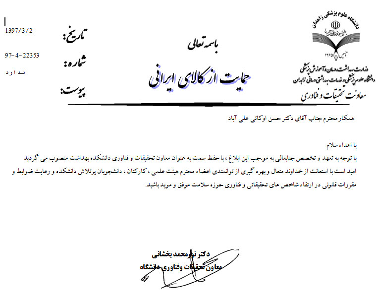طی ابلاغی از جانب معاون تحقيقات وفناوري دانشگاه جناب آقای دکتر حسن اوکاتی علی آباد به عنوان معاون تحقیقات و فناوری دانشکده بهداشت منصوب گردید