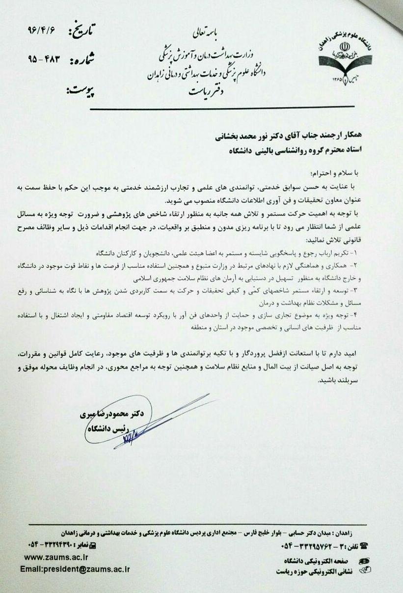 انتصاب معاون تحقیقات و فن آوری دانشگاه علوم پزشکی زاهدان