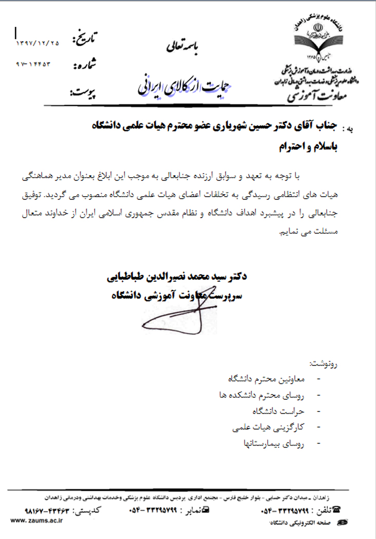 طی ابلاغی از جانب سرپرست معاونت آموزشی دانشگاه، آقای دکتر حسین شهریاری عضوهیات علمی دانشگاه بعنوان مدیر هماهنگی هیات های انتظامی رسیدگی به تخلفات اعضای هیات علمی دانشگاه منصوب گردید