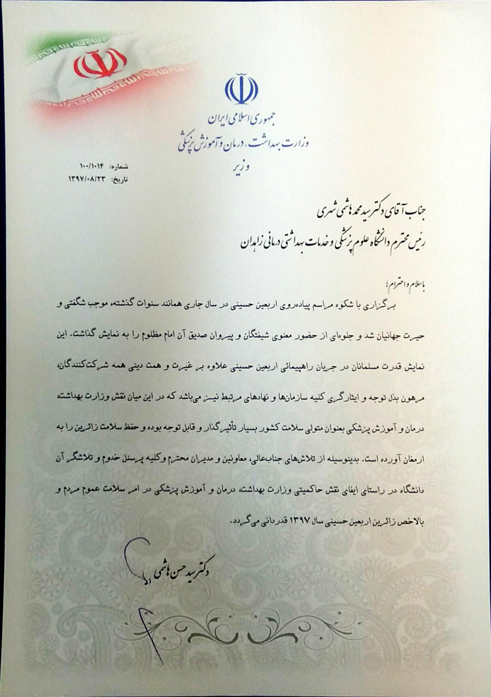 در قسمتی از این تقدیرنامه به امضاء وزیر بهداشت، درمان و آموزش پزشکی و خطاب به آقای دکتر سید محمد هاشمی شهری آمده است؛ نمایش قدرت مسلمانان در جریان راهپیمائی اربعین حسینی علاوه بر غیرت و همّت دینی همه شرکت کنندگان مرهون بذل توجه و ایثارگری کلیه سازمان ها و نهادهای مرتبط می باشد که در این میان نقش وزارت بهداشت، درمان و آموزش پزشکی به عنوان متولی سلامت کشور بسیار تاثیر گذار و قابل توجه بوده و حفط سلامت زائرین را به ارمغان آورده است. بدینوسیله از تلاش های جناب عالی، معاونین و مدیران محترم و کلیه پرسنل خدوم و تلاشگر آن دانشگاه در راستای ایفای نقش حاکمیّتی وزارت بهداشت، درمان و آموزش پزشکی در امر سلامت عموم مردم و بالاخص زائرین اربعین حسینی سال 1397 قدردانی می گردد.