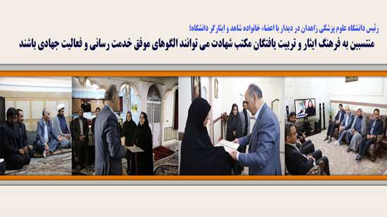 وی با اشاره به نقش کلیدی خانواده شاهد و ایثارگر در ترویج فعالیت های جهادی در عرصه خدمت به مردم گفت: دانشگاه علوم پزشکی زاهدان از پیشنهادات و نقطه نظرات اعضاء خانواده شاهد و ایثارگر در ترویج روحیه خدمت و ارتقاء شاخص های فرهنگی استقبال می کند.