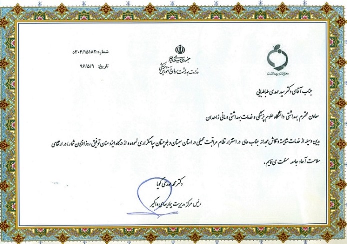 دکتر گویا رئیس مرکز مدیریت بیماریهای وزارت بهداشت ودرمان وآموزش پزشکی از دکتر سید مهدی طباطبایی معاون بهداشتی دانشگاه به دلیل تلاشهای بی شائبه در زمینه استقرار نظام مراقبت محیطی در استان سیستان وبلوچستان تقدیر کرد.