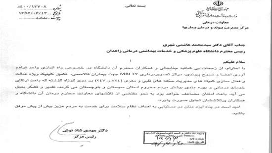 تقدیر رئیس مرکز مدیریت پیوند و درمان بیماری های وزارت بهداشت از رئیس دانشگاه علوم پزشکی زاهدان به سبب مجموعه اقدامات منجر به ارتقاء خدمات درمانی